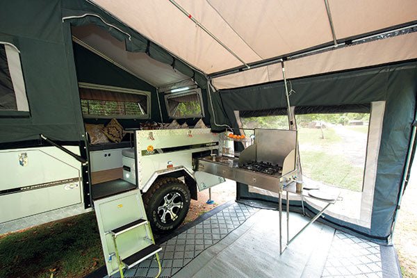 The Jawa Outlander is a big, impressive forward fold camper that looks good behind any tow vehicle. Its deep body (quite correctly) implies good internal storage and plenty of room to live comfortably under canvas.