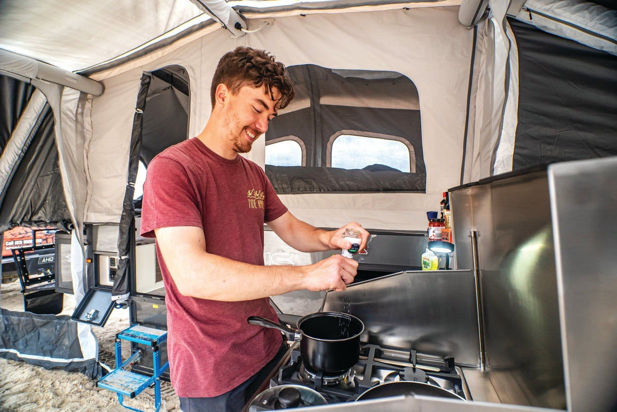 On the other side of the axle and door, the kitchen slide rolls out. It’s quite a big unit with four-burners, gigantic wind guards and a heavy stove grate. Extra working space extends from the end, a cutlery drawer slides out at the front, while closest to the camper body is the sink and a pop-up two-tier rack. Close at hand are 12V plugs and Nitto quick release fittings to plug into water and gas. Drainage is out of a pipe under the sink.
