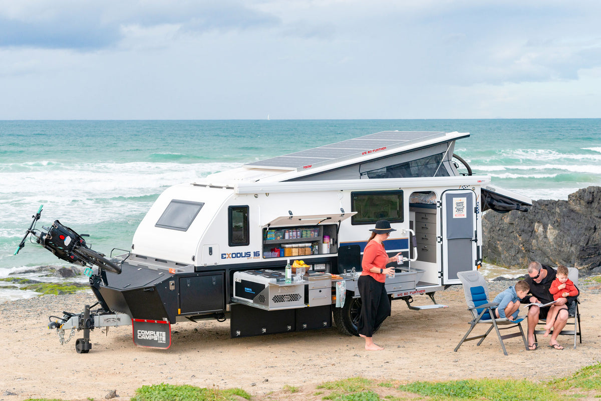 In terms of comforts and ease, the Exodus 16 is genuinely configured to support a family, of up to five, to live comfortably for an extended period. Inside, there’s a full queen bed and three kids' bunks, all serviced by lights, USB ports and decent storage compartments. A roof-mounted sail track makes it possible to partition the sleeping areas so that little humans aren’t disturbed when parents enter the rig late at night. While these features are great, it’s outside that the Exodus really struts its stuff in terms of amenities and easy-to-use features. The external flip-up ensuite provides a small shower room with internal light and a handheld shower rose; a perfect place to send the kids after a day on the beach before they venture into the impressive galley space or indoors.