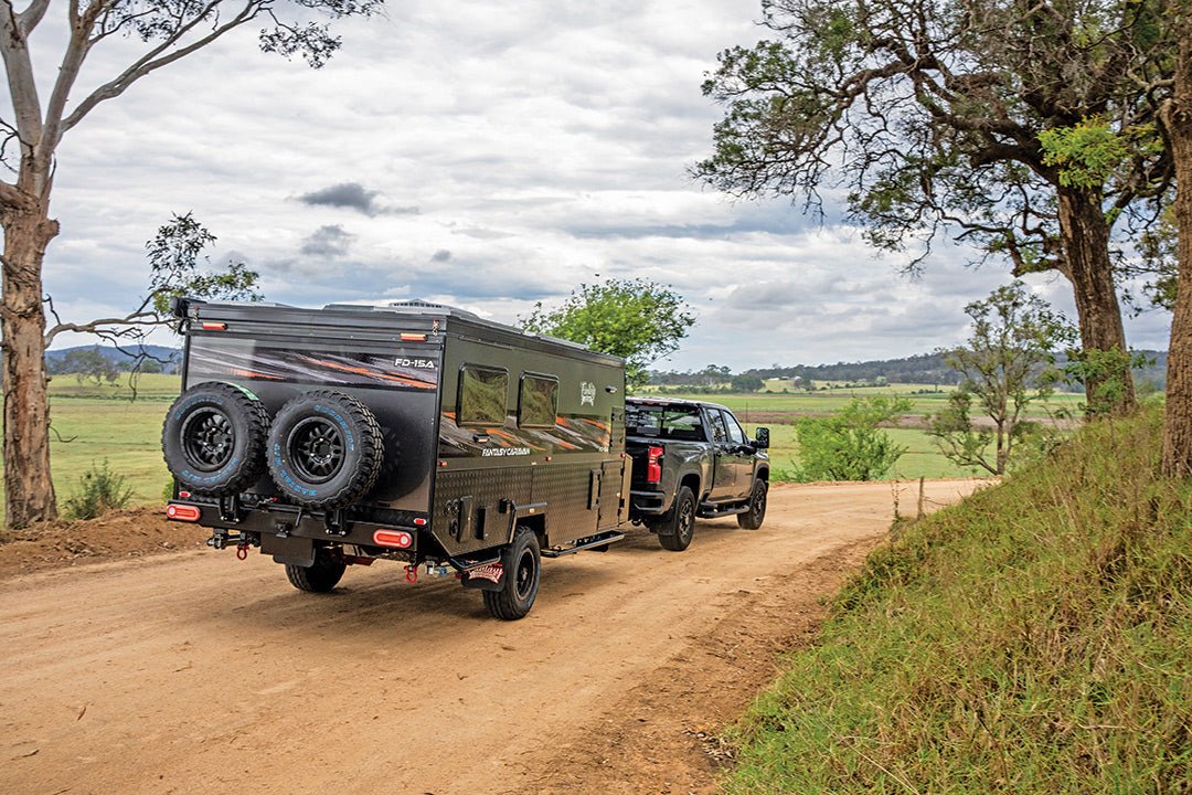The 15ft 3in Fantasy is relatively hefty for its size at 2430kg empty. You can legally add a 570kg payload for an ATM at 3000kg meaning you will need a higher class of tow vehicle like most of the twin-cab ute style 4WDs that are common in our market. Fantasy chose a Chev 2500, and it’s fair to say it had no trouble towing the little FD-15A over our course.