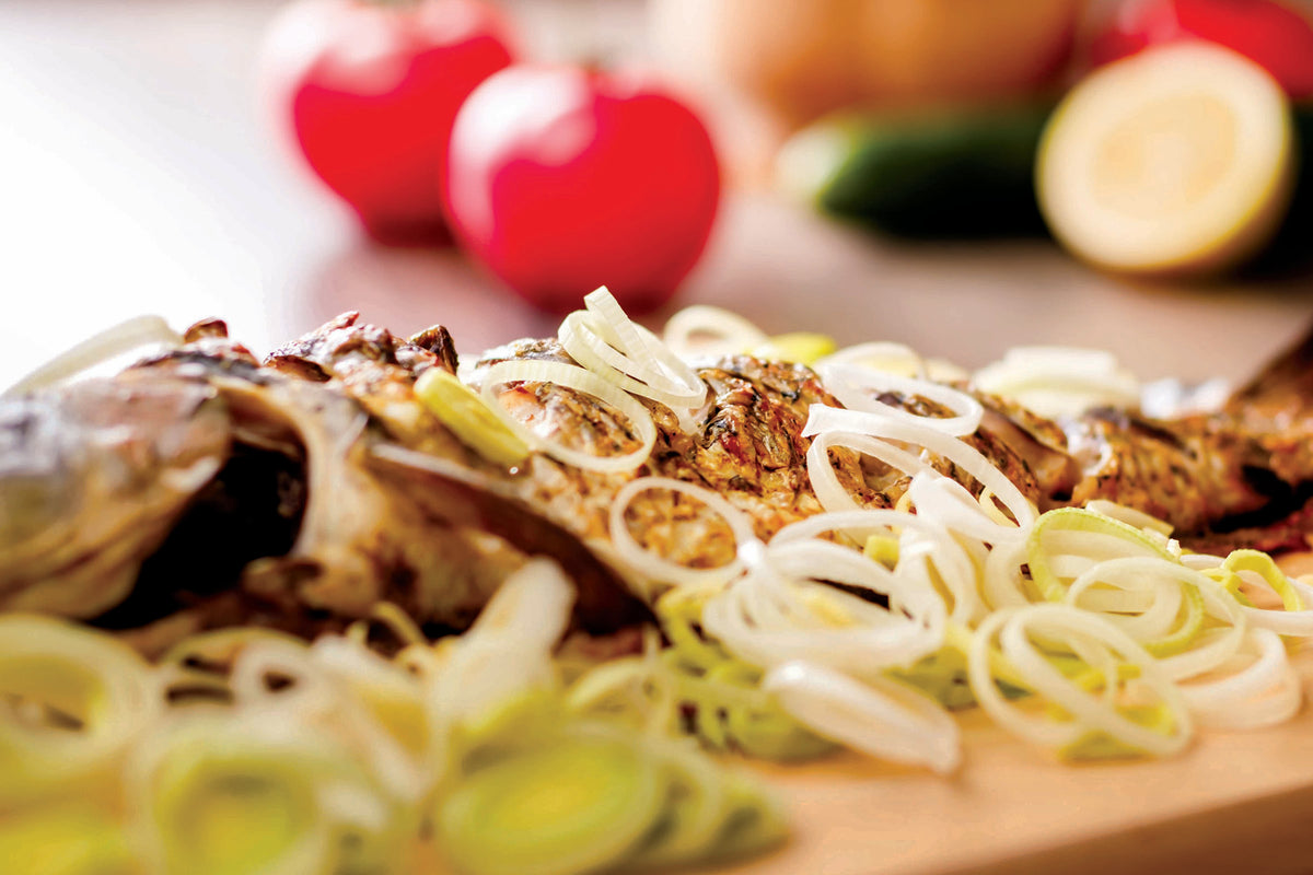 As is often the case with fish, you can opt to cook whole, then just pick at the good bits when you eat, or you can cut off fillets. Dice up some spring onion, focusing on the clear parts nearer to the base and disposing of the thin green bits up top; then either sprinkle the spring onion over the fish or place it into the cavity between the sides. Cut a lemon in half and squeeze that sour juice all over the thing; next load a knife up with butter and rub it over the exposed meat; then splash on some white wine (try not to go overboard) and grind some salt and pepper over the top of it all, before sprinkling dried chives to finish. If you want more substance, a diced tomato will go nicely. Next step, wrap up the fish in foil and place it on the barbecue, or by campfire coals, flipping it midway through cooking.