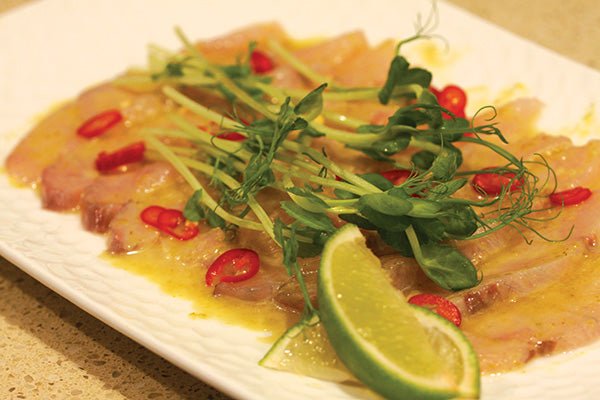 To assemble, layer the fish on a serving plate, and add the garnishes. Drizzle the remaining marinade over the salad and serve.