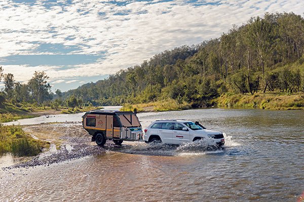 We couldn’t resist testing out to see whether or not the camper was as tough as its rugged good looks promise, so we set a course for a little campsite on the banks of the river via a rough and tumble crossing. And behind our Jeep, the Evolution easily waded and scaled through the water and rocks.