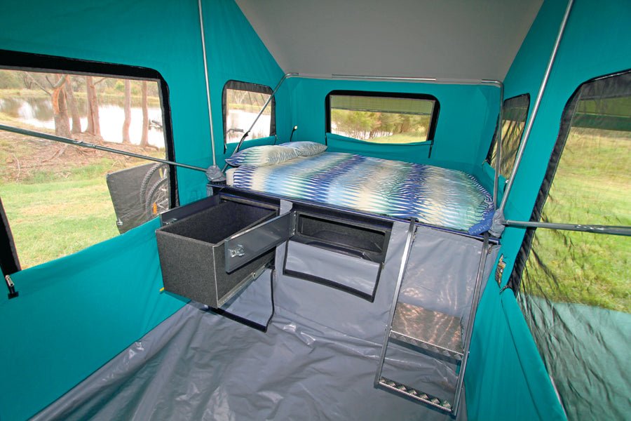 Internally, the tent has a high peak for good drainage, queen-size innerspring mattress, hard-wired ceiling LED light strip, LED reading lights and an excellently-designed step-ladder in a carpeted bag. All windows have loop and hook fasteners for easy fitting of the matching clears.