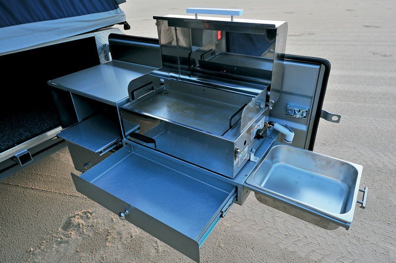 The kitchen is a tailgate design, incorporating good bench space and, on our review model, the optional Sovereign barbecue. These things are brilliant. You can cook a roast without starting a fire, fry up eggs or take off the hotplate and cook over the open flame.
