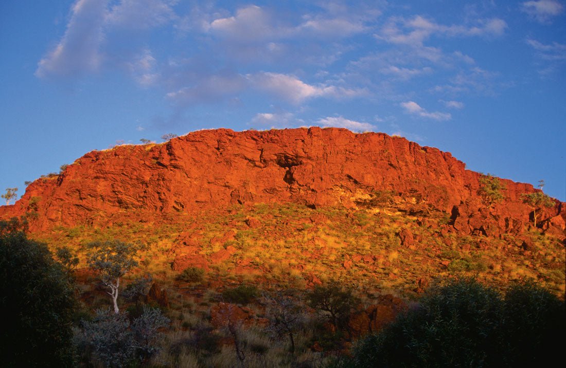 This isolated hillside is literally covered with petroglyphs depicting animals, people, spears, boomerangs and water symbols. This site is one of the best examples of Aboriginal rock carving to be found anywhere, and is definitely worth the trip in. Near to the art site you will find the Punda Rockhole, riverbed drive, steep cliffs, tall paperbarks, cassias, and the pretty solanum and mulla mulla wildflowers. The stark white of the river gums against the red soil and cliffs is particularly appealing along this trail.