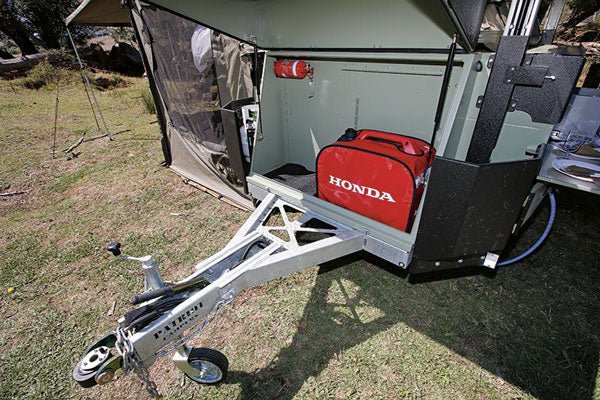 As we travel around to the rear of the unit and still under cover from the awning, we find a convenient pull-out tray that is long enough to support an optional 50-60L fridge ($1699 for the EvaKool 60L Fridge Dual Zone shown), a large pantry storage box, pull-out bench extension with utensils storage underneath, as well as a further pull-out mounting plate for a demountable plastic sink. Hence, all of the cooking and catering equipment is conveniently fitted on one side and under the same awning. Next to the pull-out slide is a massive 480L cavity storage that is big enough for a small inflatable boat and its motor! This terrific fully dust sealed storage is ideal for tables, chairs and bulky items and, considering a total available trailer payload of around 500kg, it is capable of carrying some quite heavy items as well. The main body of the trailer is also pressurised to help keep that nasty red dust out. On the driver’s side we find yet another fully sealed full length storage cavity which is accessible with, or without the tent assembled. Overall there is a massive 1400L of storage offered by the X2 unit – simply amazing in such a compact trailer with so many features.