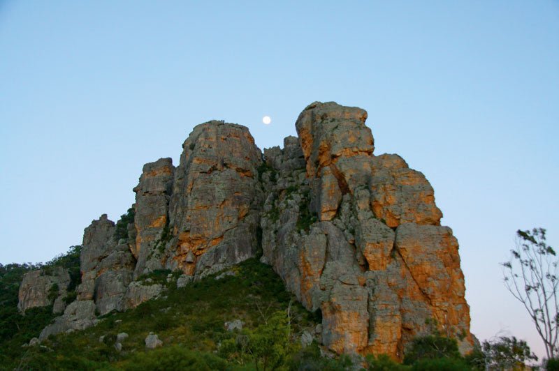 From Natimuk you can see Arapiles in the distance. It doesn't quite loom, it's a little too squat for that, but arrive at sunrise and it will greet you with a glowing orange face. It's just a short drive down the road to get to the Parks Victoria campground at the base of the mountain. Here you will find the sites are on a slight slope, and are equipped with toilets (one block of long drop and done flushing) and bore water. Climbers are a notoriously skinflint bunch, so camping costs just $2/person/night.