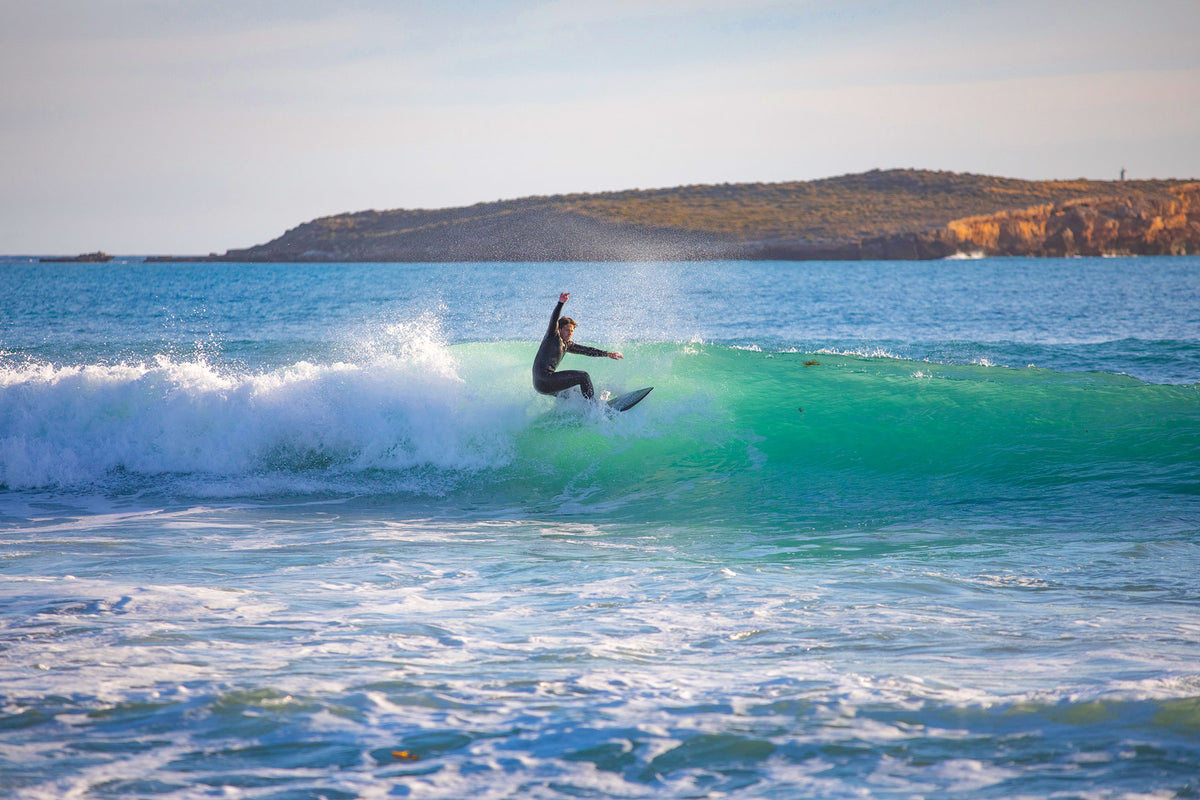 The peninsula’s western side is cleaner and less weedy. The topography is more dramatic, the ocean more exposed and the swell more dynamic. The inland is mostly grain farmland, golden and wavy at times, charred and shorn nearly bald at others. But there are beautiful painted water towers near Edithburgh, Yorketown and in other places along the Mural Trail. There’s also a ‘Red Devil’ Bristol M1C Monoplane in Minlaton, pink salt lakes near Yorketown, and the Moonta Mines relics, museum, and sweet shop inland from the jetty. The Cornish flag (black with a white cross) still cracks proudly in the offshore breeze, a homage to Cornwall settler heritage.