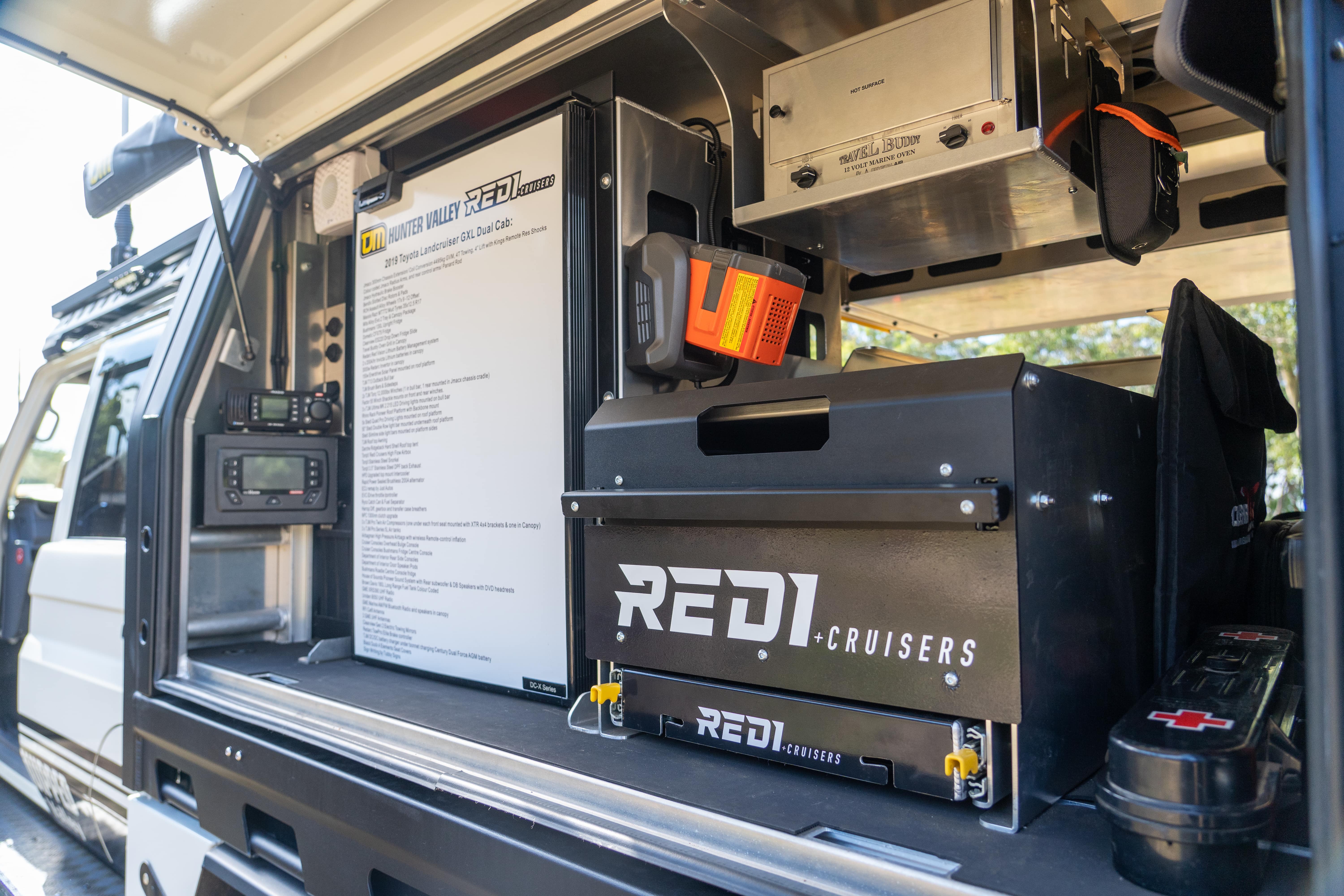 Making the most of the newfound real estate with the 300mm longer chassis, TJM Hunter Valley brought in local canopy manufacturer Mits Alloy to piece together one of their Evo 2 tray and canopy packages. Built locally in Newcastle and constructed out of lightweight aluminium, the Evo 2 setup provides huge touring potential without eating into the GVM any more than necessary. On the inside the team have fitted one of the most elaborate touring setups of all time in order to show what can be done with your rig. Think of it like an Ikea showroom with six different kitchens and you’re on the right track. On the passenger flank a Redarc Redvision Battery Management system keeps twin 200Ah Invicta Lithium running late into the night. A 150W Enerdrive solar panel up top keeps the batteries topped up at camp, while a huge 200A sealed alternator fills them up in no time on the road. A 3000W Redarc 140V inverter has also been fitted up. Under the bonnet a TJM DC to DC charger keeps a single Century Dual Force AGM battery charged. The Canopy also features not one but two fridge options, a 130L upright Bushman’s fridge on the passenger side, with a Dometic CFX75 on the drivers, a Clearview drop down fridge slide giving easy access.
